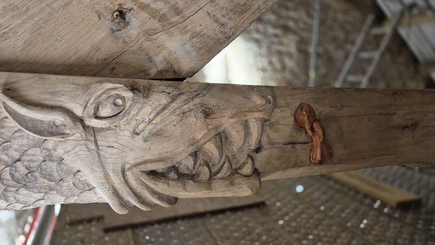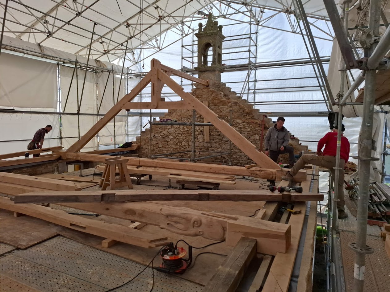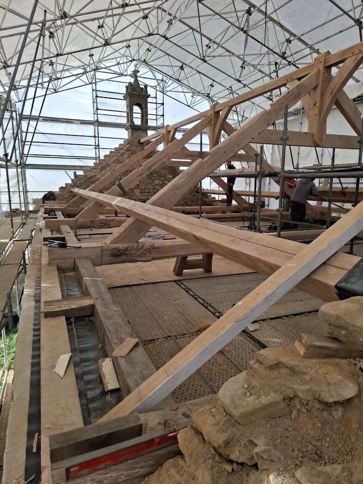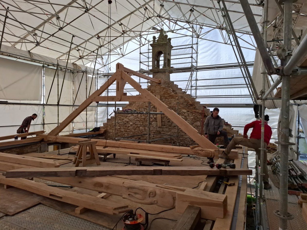 Les compagnons de l’entreprise LE BER sont venus, mi-février, effectuer la levée et l’installation de la charpente en lieu et place de l’ancienne. Les sculptures sont donc maintenant en place dans la chapelle.