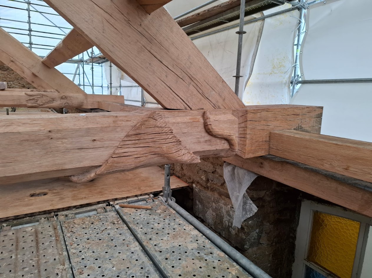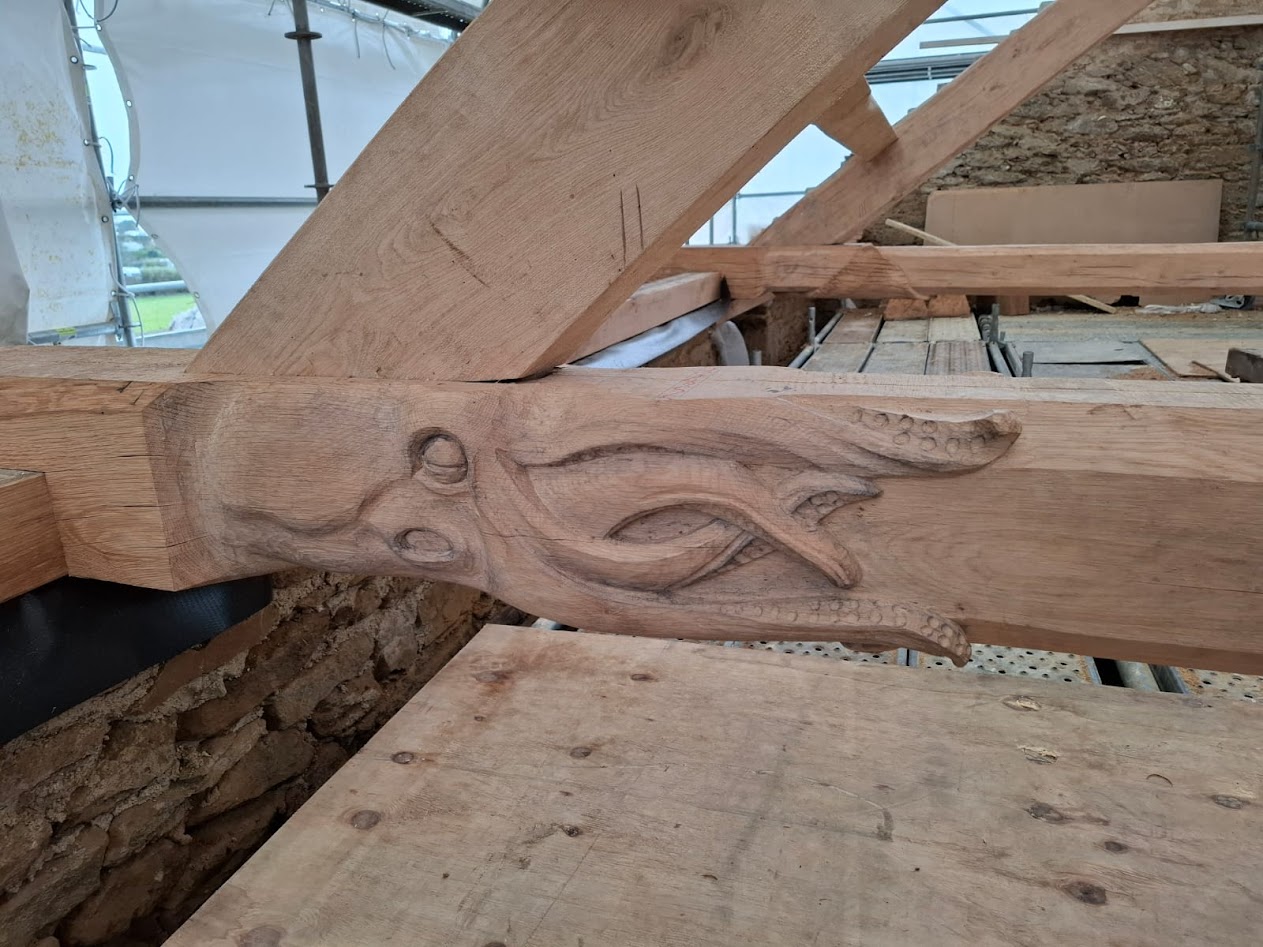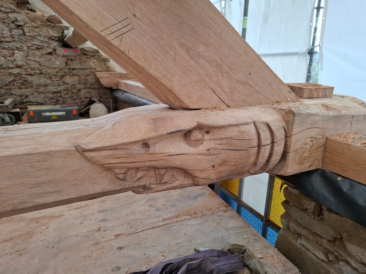 Depuis fin novembre, la charpente est en construction dans les ateliers de l’entreprise LE BER. Cette charpente a la particularité d’être sculptée 10 sculptures originales, dont 6 engoulants, créés par les ateliers Le Ber, en charge des lots charpentes et menuiseries sur ce chantier.