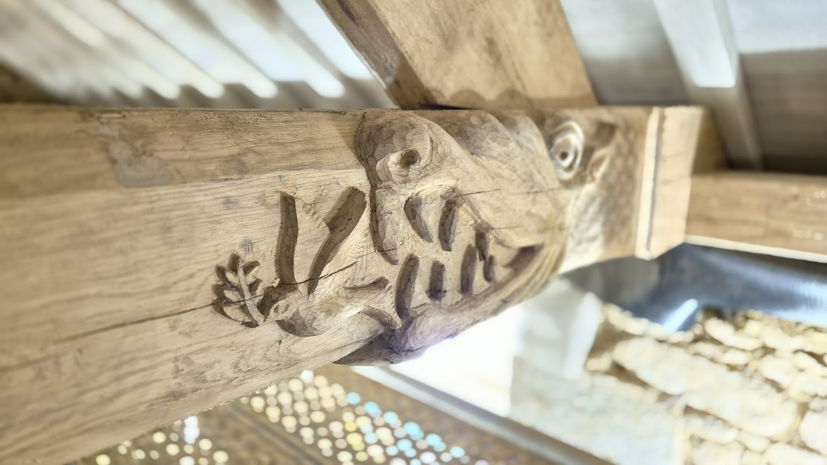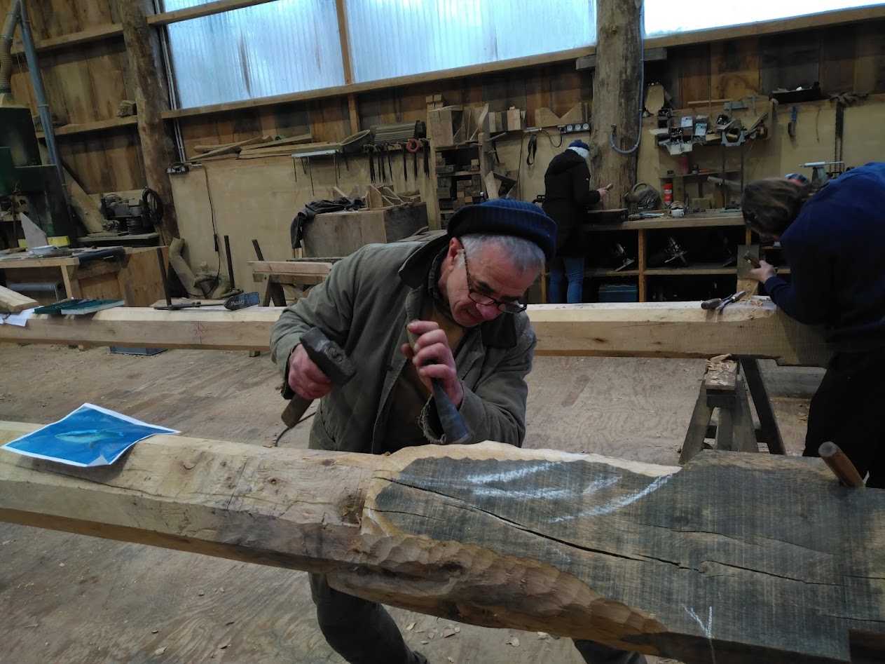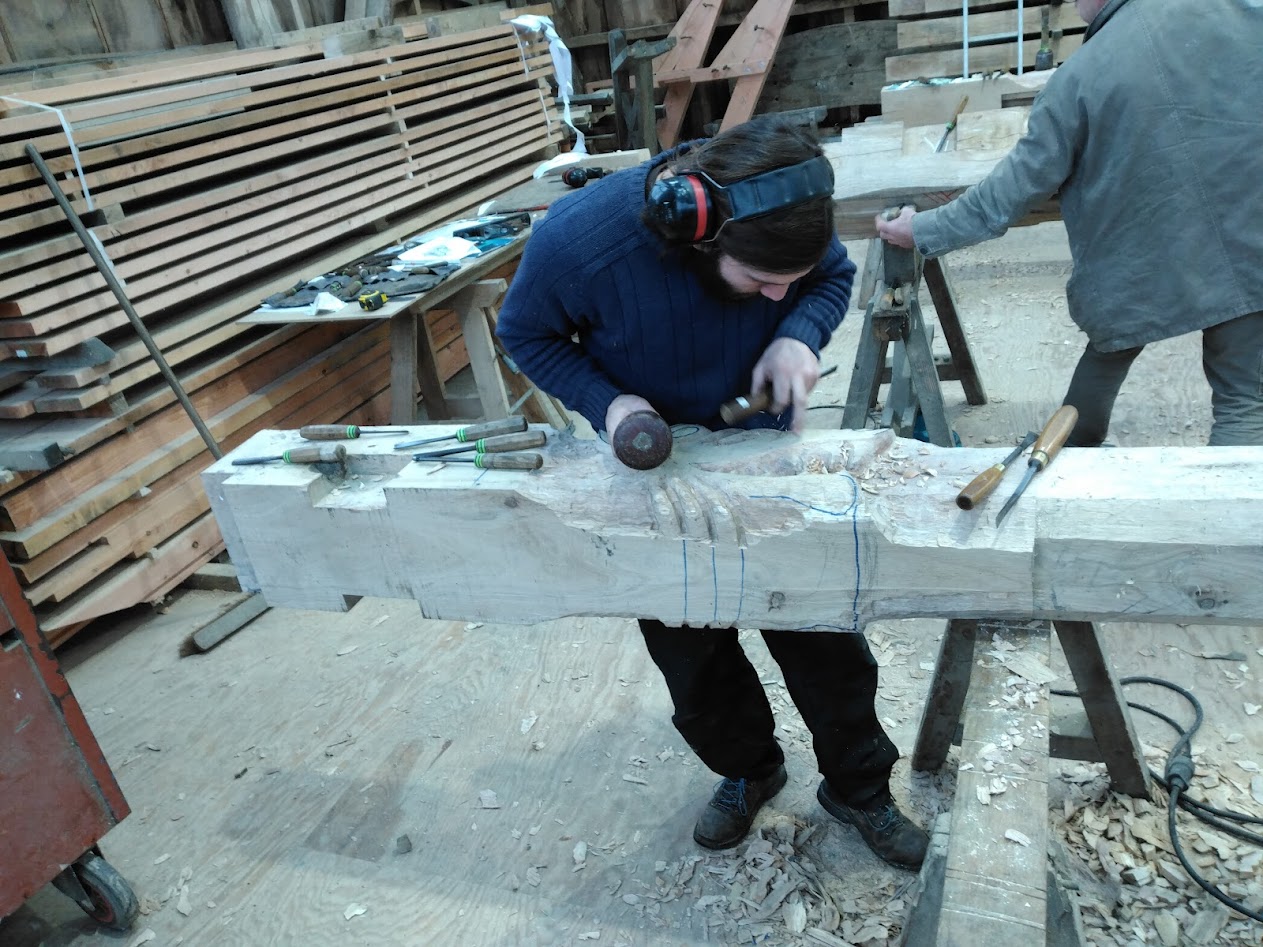 Depuis fin novembre, la charpente est en construction dans les ateliers de l’entreprise LE BER. Cette charpente a la particularité d’être sculptée 10 sculptures originales, dont 6 engoulants, créés par les ateliers Le Ber, en charge des lots charpentes et menuiseries sur ce chantier.