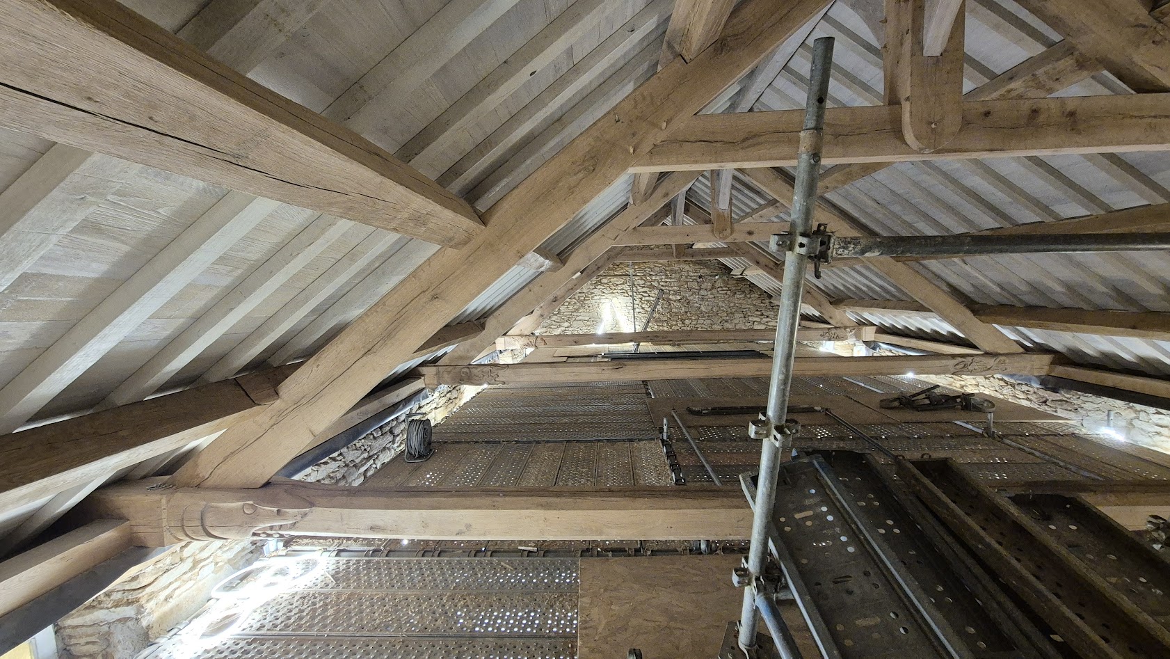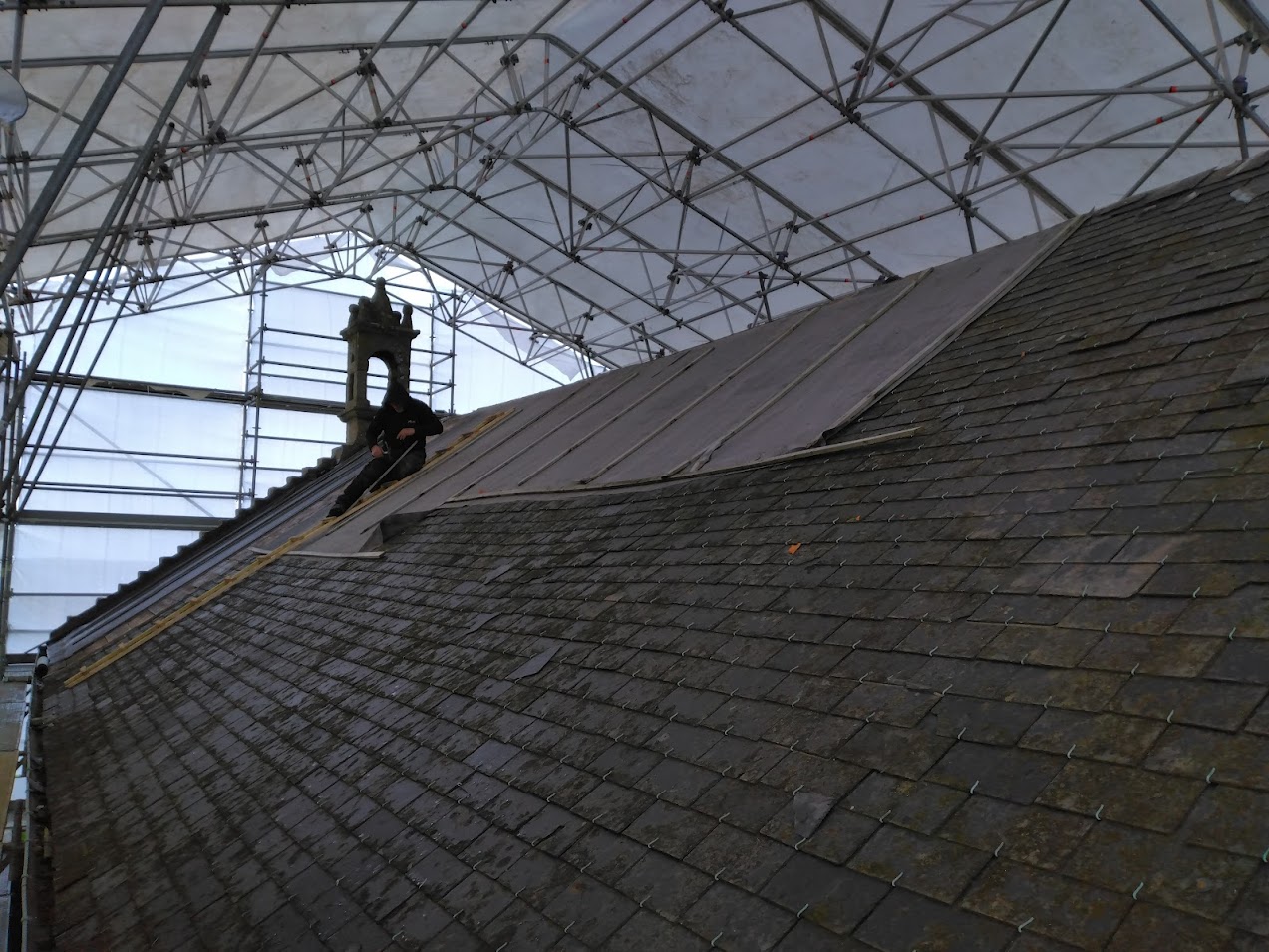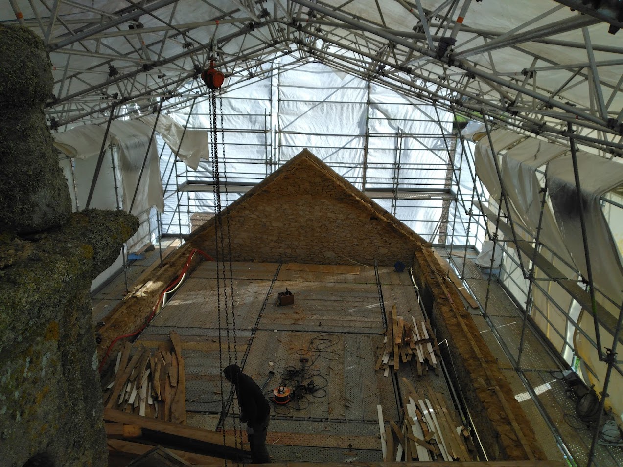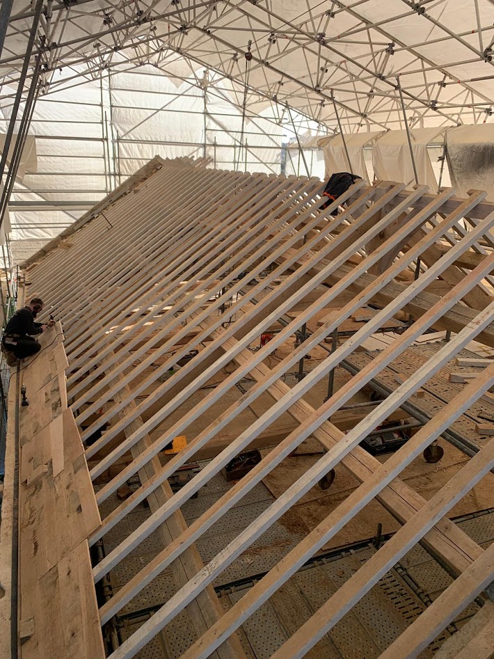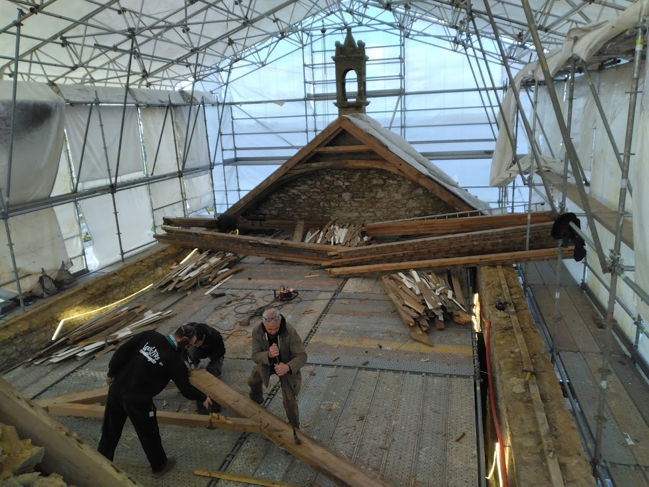 Début janvier, l’entreprise ABARNOU est venue draper d’une structure blanche la chapelle Sainte-Marguerite, afin de la protéger de toutes intempéries, le temps de la dépose et de la pose de la charpente et de la couverture. La plateforme intérieure, en parallèle des échafaudages présents sous le parapluie, permet aux compagnons de travailler à hauteur en sécurité.