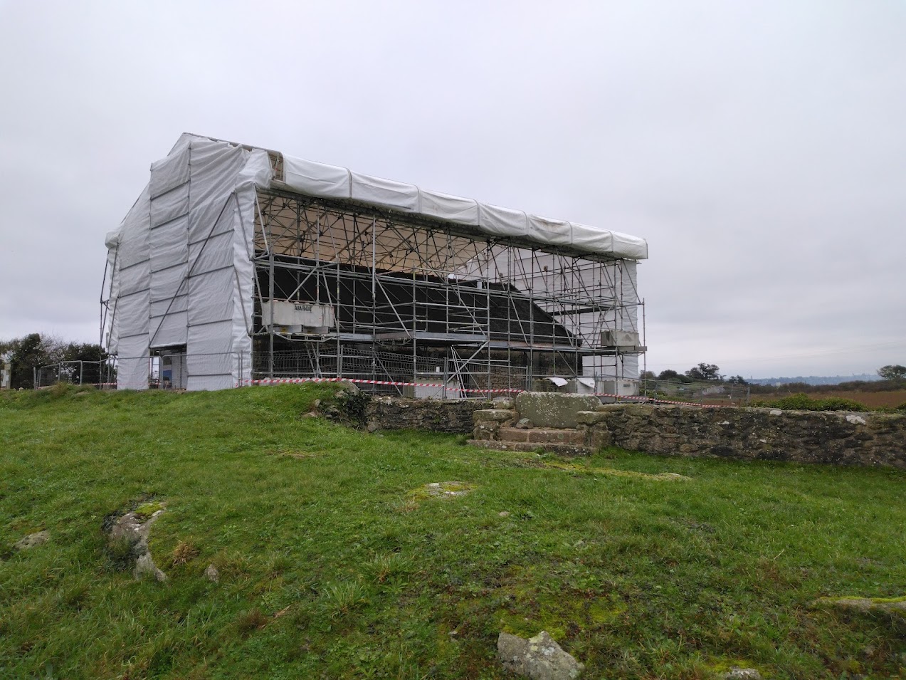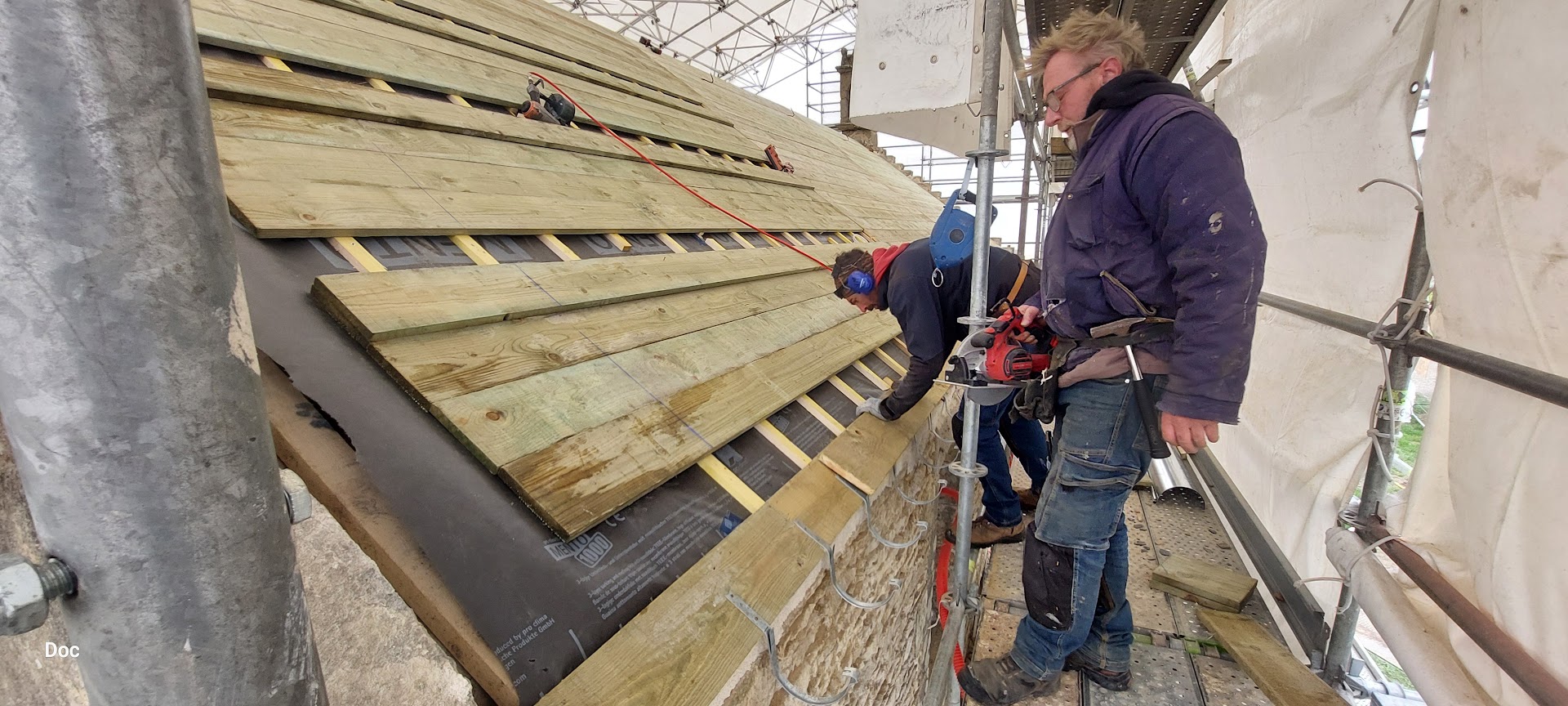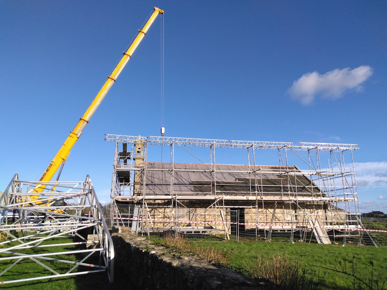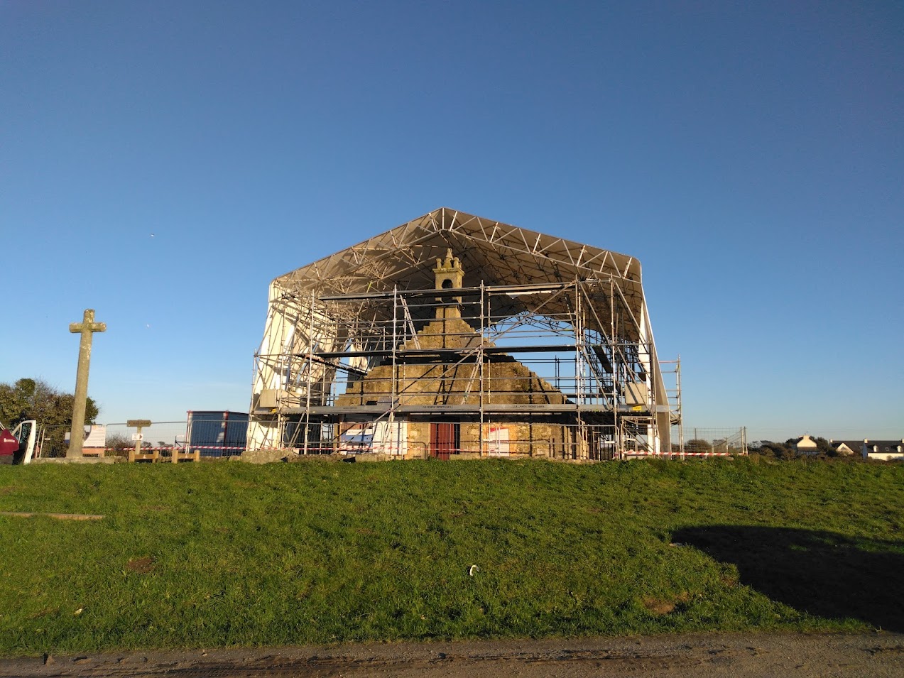 Début janvier, l’entreprise ABARNOU est venue draper d’une structure blanche la chapelle Sainte-Marguerite, afin de la protéger de toutes intempéries, le temps de la dépose et de la pose de la charpente et de la couverture. La plateforme intérieure, en parallèle des échafaudages présents sous le parapluie, permet aux compagnons de travailler à hauteur en sécurité.
