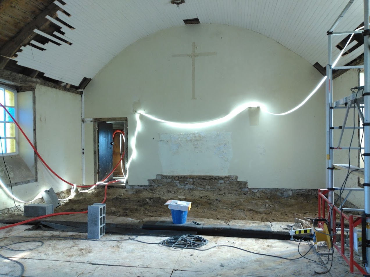 Le lambris a également été posé dans la foulée. Sa finition, une peinture à l’huile de couleur blanche transparente, le protègera tout en privilégiant la luminosité de la chapelle. L’ensemble de la charpente et les sculptures bénéficieront du même traitement lors de la deuxième phase de travaux.