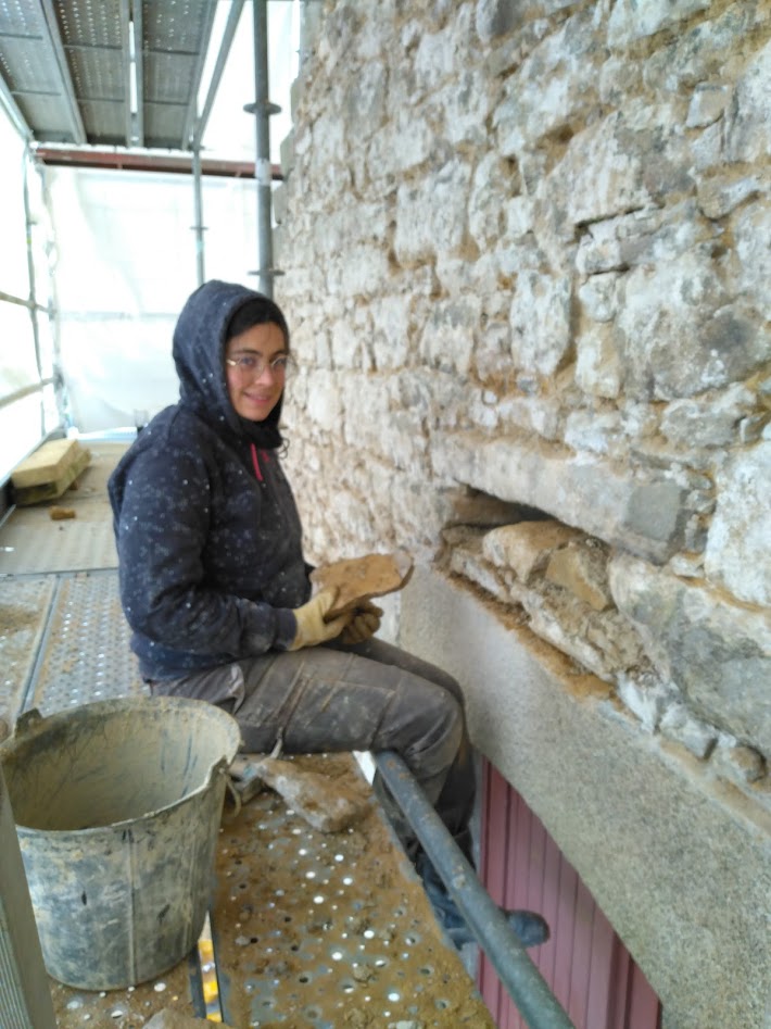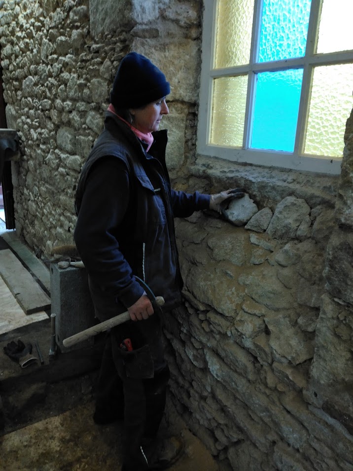 Les travaux ont débuté début novembre par le piquetage de l’enduit intérieur en ciment, d’épaisseurs variables. Un gros boulot qui s’imagine mieux en voyant la quantité de gravats dans la benne ! La purge des matériaux parasites (morceaux de bois ou de métal) et le rebouchage des lacunes à la pierre façon puzzle ont terminés cette première étape.