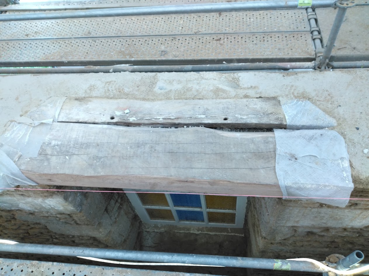 Les maçons ont également effectué le remplacement des linteaux des 3 portes et 4 fenêtres. Ceux en place étaient des pièces de récupération, vraisemblablement de l’ancienne chapelle sur l’île Tariec, potentiellement issus de la construction de bateaux. Ils ont été changés lorsqu’ils étaient insuffisants en portée ou trop fortement dégradés pour être conservés.