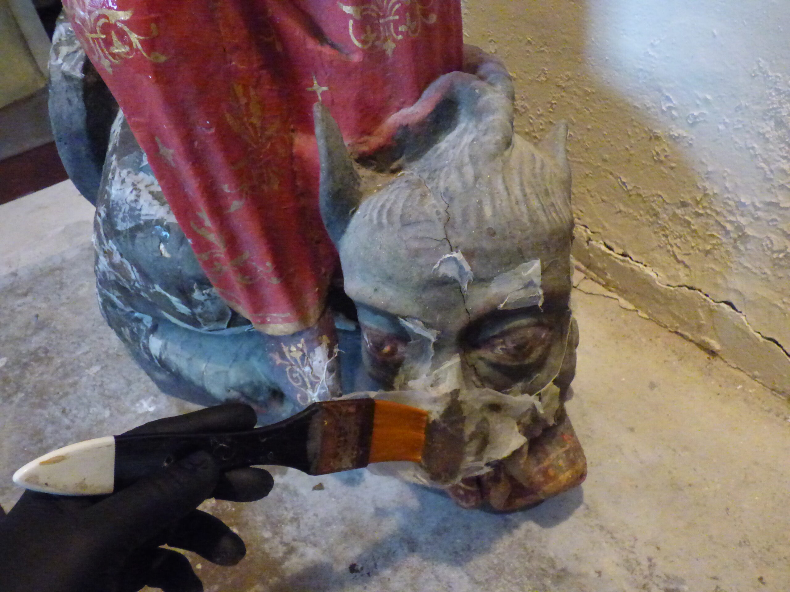 Leur déplacement a nécessité la mise en place de consolidations temporaires par bande de papier Japon pour éviter la perte de couches picturales, qui seraient dommageables pour la restauration. Ces « pansements » ont également le rôle d’éviter toute contamination au plomb des lieux et artisans, plomb contenu dans les peintures anciennes.